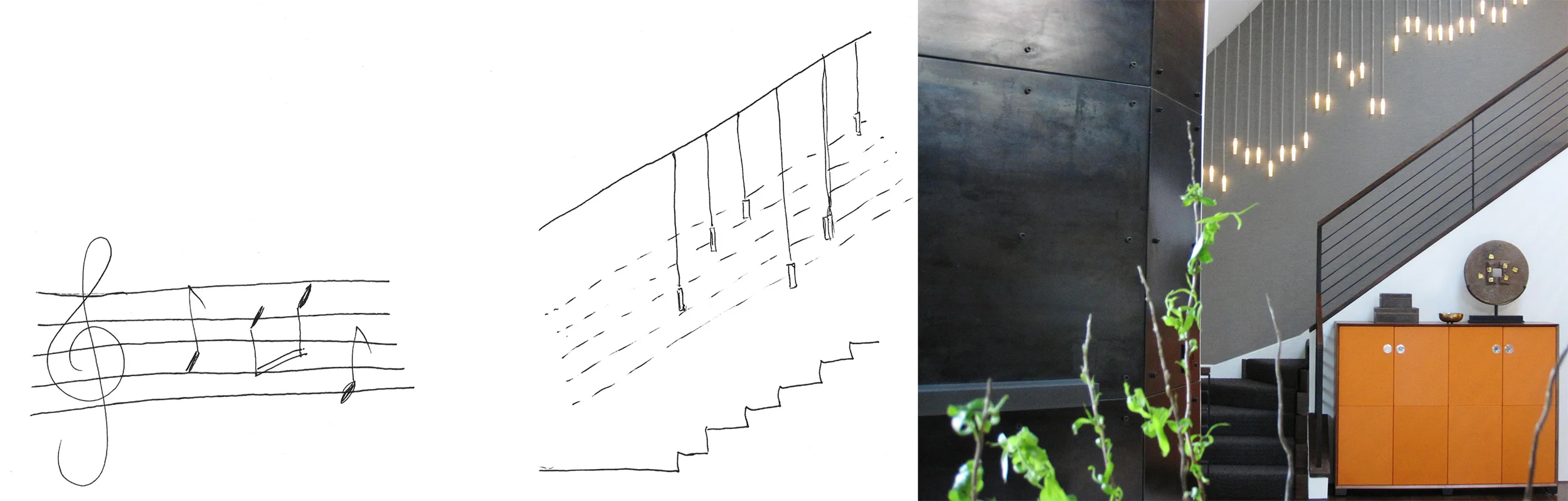 For example, a client shares with us that he plays piano extensively and wants an area of his home to reflect his passion. We produced several options, and collaboratively chose one of his favorite songs that he shares with his wife and converted the musical notes into a series of custom-made LED pendants. The "notes" are effectively "played" along the staircase, resulting in a beautiful design that impresses guests, and produces an abiding satisfaction for our client, who can "hear" their favorite music every time they ascend the stairs of their home.